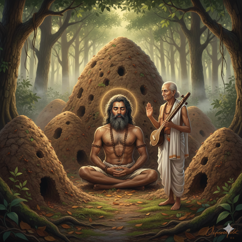 At first, Ratnakar struggled to do so. Naradji then asked him to say “Mara” instead. With continued penance over many years, anthills formed around him as he meditated tirelessly. Pleased with his unwavering devotion, Lord Brahma blessed him and gave him the name Valmiki.
