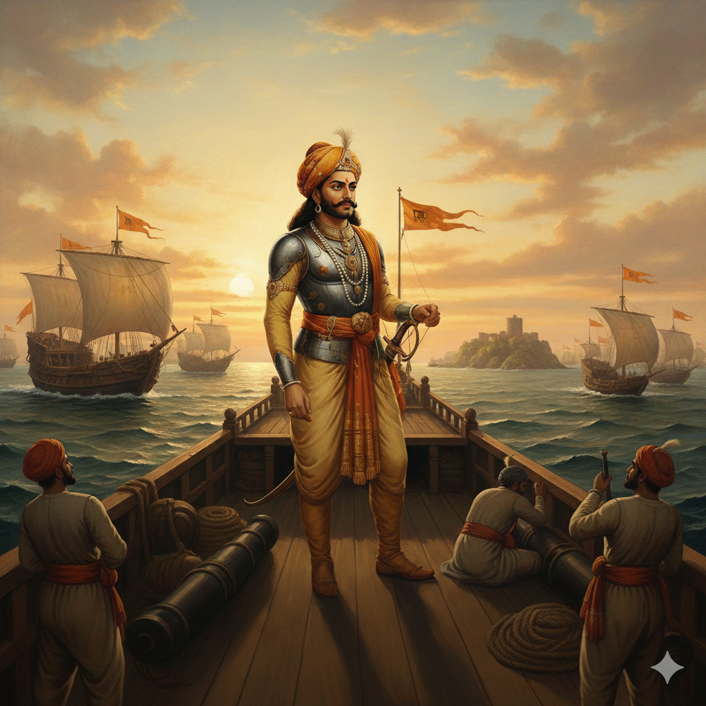 छत्रपति शिवाजी महाराज, महान मराठा योद्धा, न केवल साहस और नेतृत्व के प्रतीक थे, बल्कि दूरदर्शी रणनीतिकार भी थे। उन्हें भारतीय नौसेना के जनक के रूप में सम्मानित किया जाता है क्योंकि उन्होंने भारत के तटों की रक्षा के लिए एक सशक्त नौसेना की स्थापना की। उनके द्वारा संसाधनों के कुशल उपयोग और आत्मनिर्भरता पर दिया गया बल आज भी हमें प्रेरित करता है।